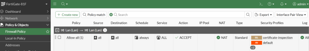 必須存在允許此流量的防火牆政策(來源介面和目標介面相同)。如果不存在允許政策,則流量將匹配隱式拒絕策略並被丟棄。