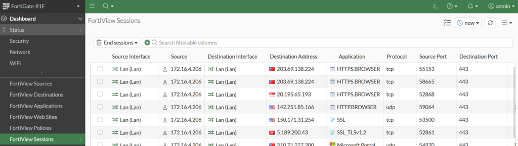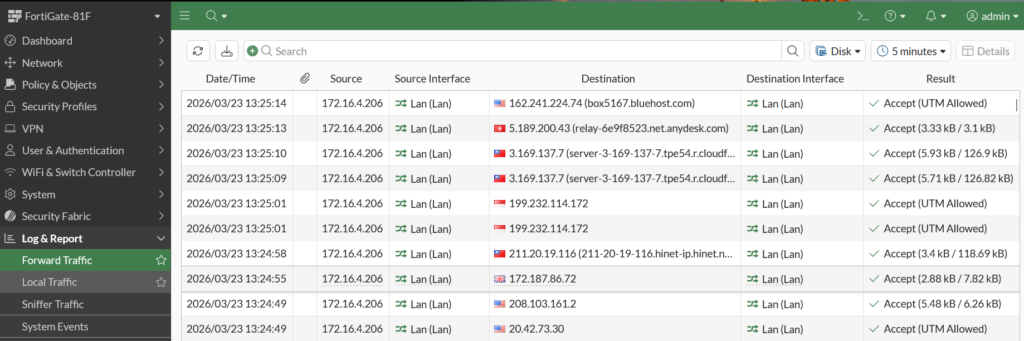 流量將透過同一介面進行雙向轉送,無需防火牆策略且不會產生流量session與log為隱式允許。
